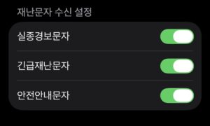 사용자는 이 메뉴에서 ‘재난 문자’와 ‘긴급 재난 문자’ 수신 설정을 모두 초록색으로 켜서 지진, 홍수, 테러 등 인명 피해가 예상되는 상황에 대한 경고를 받을 수 있습니다.